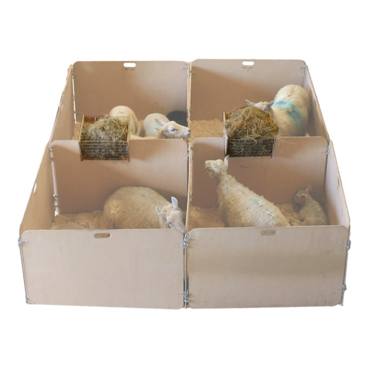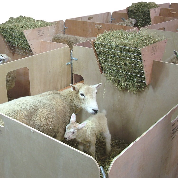 Shearwell's hay racks slot into the middle partition of lambing pens to feed two ewes.